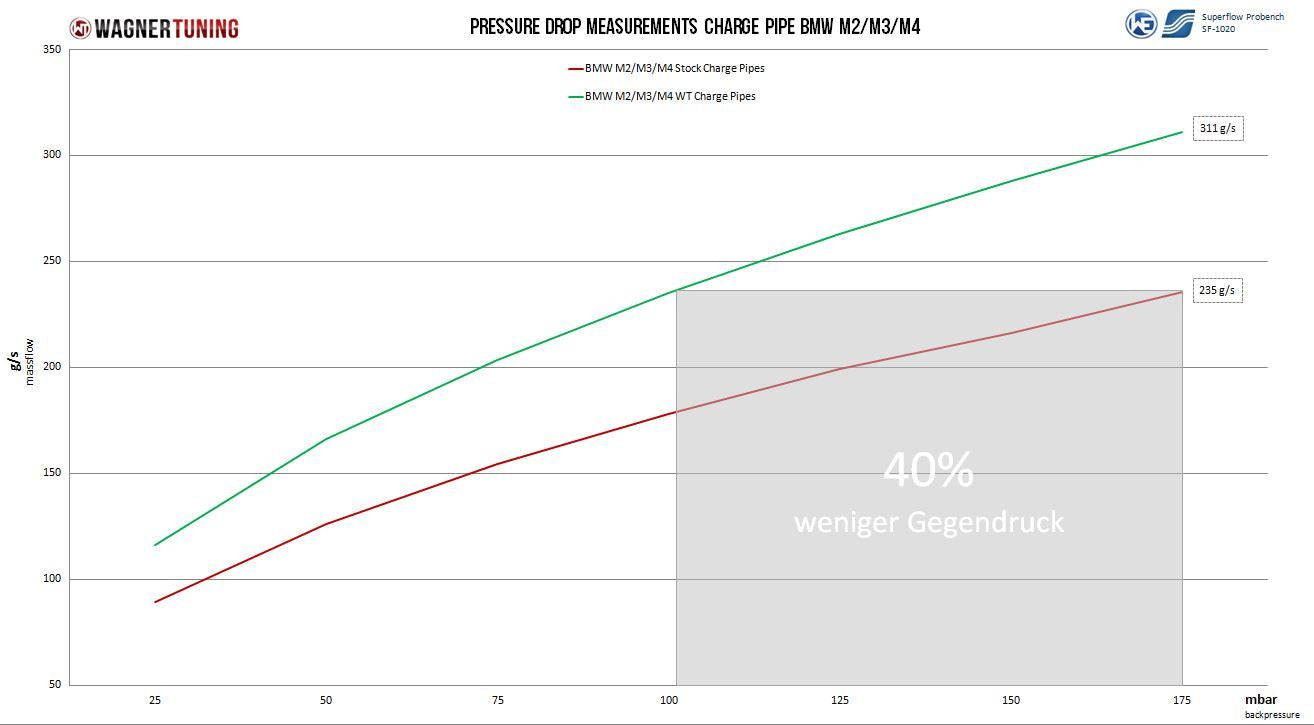 Im Vergleich zu den OEM Charge Pipes bieten die Wagner Tuning Charge Pipes einen größeren Strömungsdurchmesser und minimieren interne Querschnittsveränderungen, was zu einem um 40% geringeren Gegendruck führt. Dies entlastet die Turbolader und verbessert das Ansprechverhalten.
